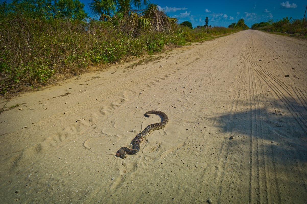 This broke my heart. I do not see the need for the wanton killing of eastern diamondback rattlesnakes, but I guess the assholes in the truck did. It’s bad enough they swerved to hit this magnificent creature, but to add insult to injury they cut the rattle off. As the youth of today would say, WTF?
