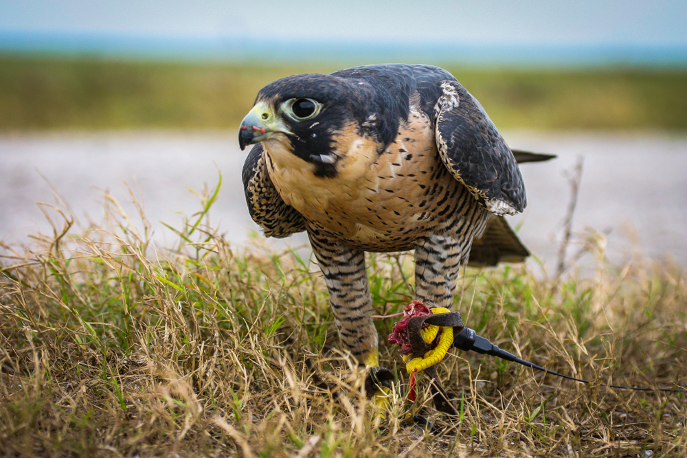 As my friend’s peregrine falcon pulls at a tiny morsel of food after an unsuccessful flight, I laid down on the ground to grab this shot. He paused for a brief second to give me stink eye for interrupting his snack time. Well maybe if we didn’t have to chase him for two miles I wouldn’t need to lay down!