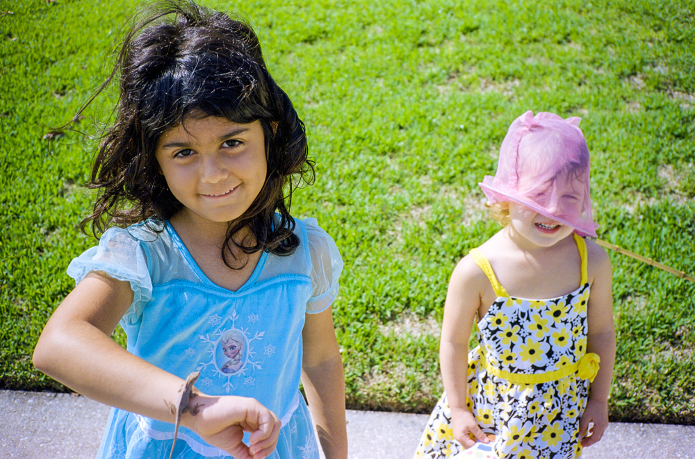 So my niece and daughter wanted to catch a few critters while we were visiting Gainesville. Started with small bugs and butterflies, then worked our way up to lizards. Soon Emily realized that the net wasn’t very good for the brown anoles, so she decided to wear it. Who’s catching who?