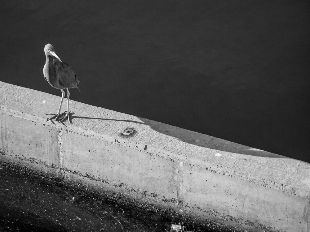 This little blue heron was surprised and indignant I caught him making a mess on the concrete barrier he was hunting fish on. Doesn’t he know, never poop where you eat?