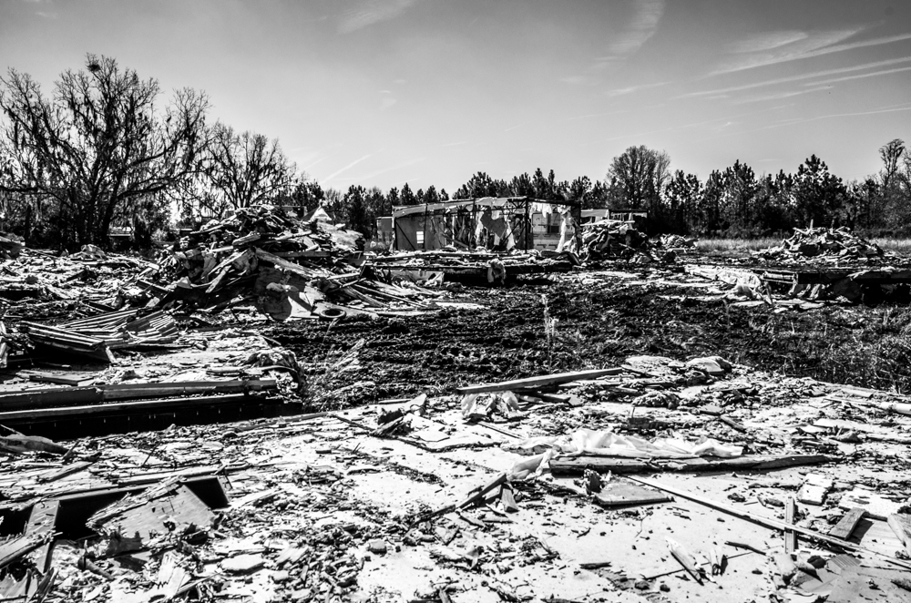 War-torn village? Tornado destruction? No, just an old group of run down trailers that the owner has finally decided to (very slowly) take down outside of Starke, Florida. I have an older photo of the trailers still standing from a few year back, and will add it to the Project when it resurfaces.