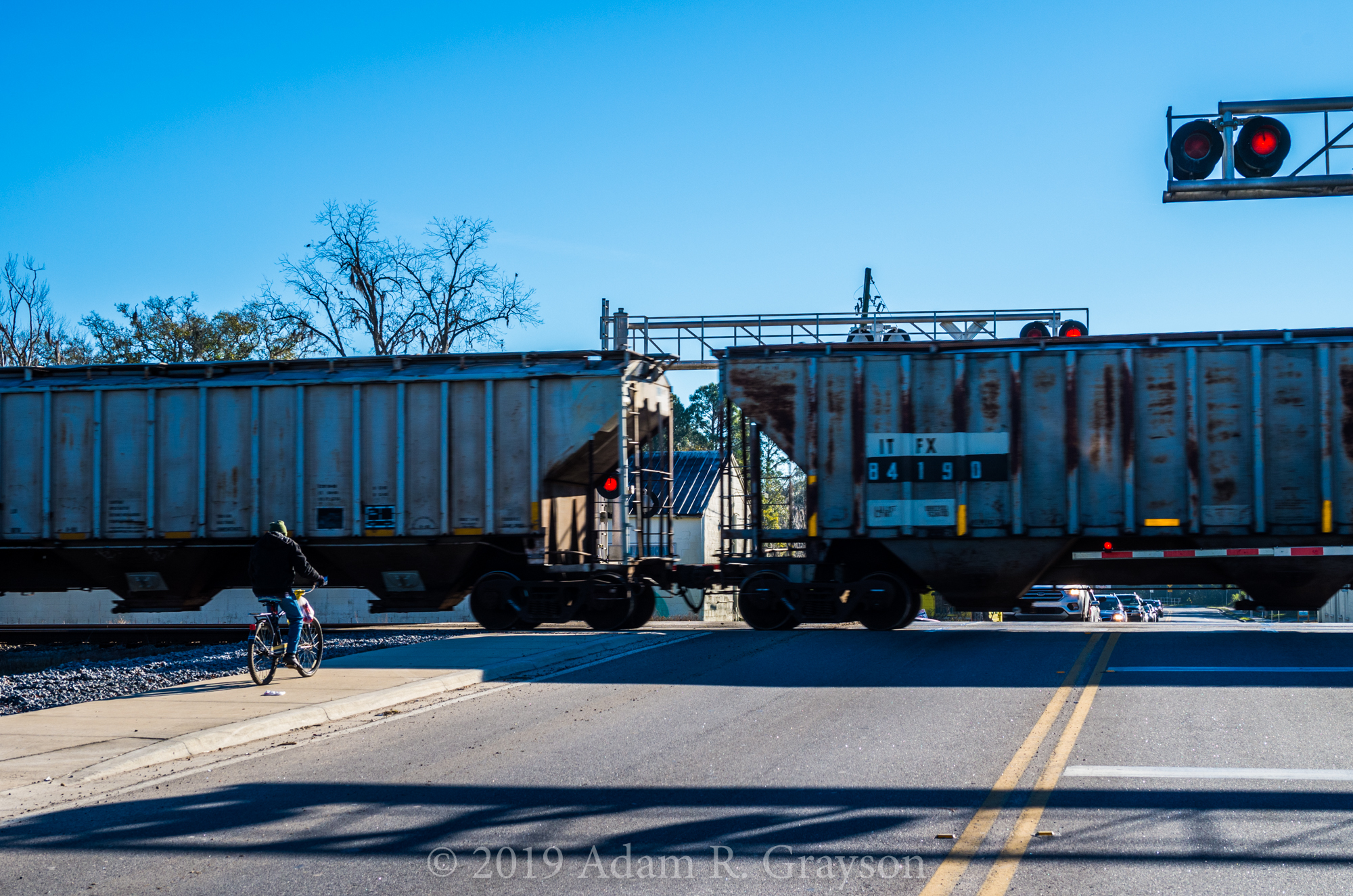 While waiting for the world’s longest train to pass, this guy rides up on his bike and it did not look like he was going to stop. Of course at the last second, and far closer than I would venture, he stopped to wait for the train like the rest of us. The kid in me hoped for an E.T. moment, but on this day patience and gravity proved to the choice.