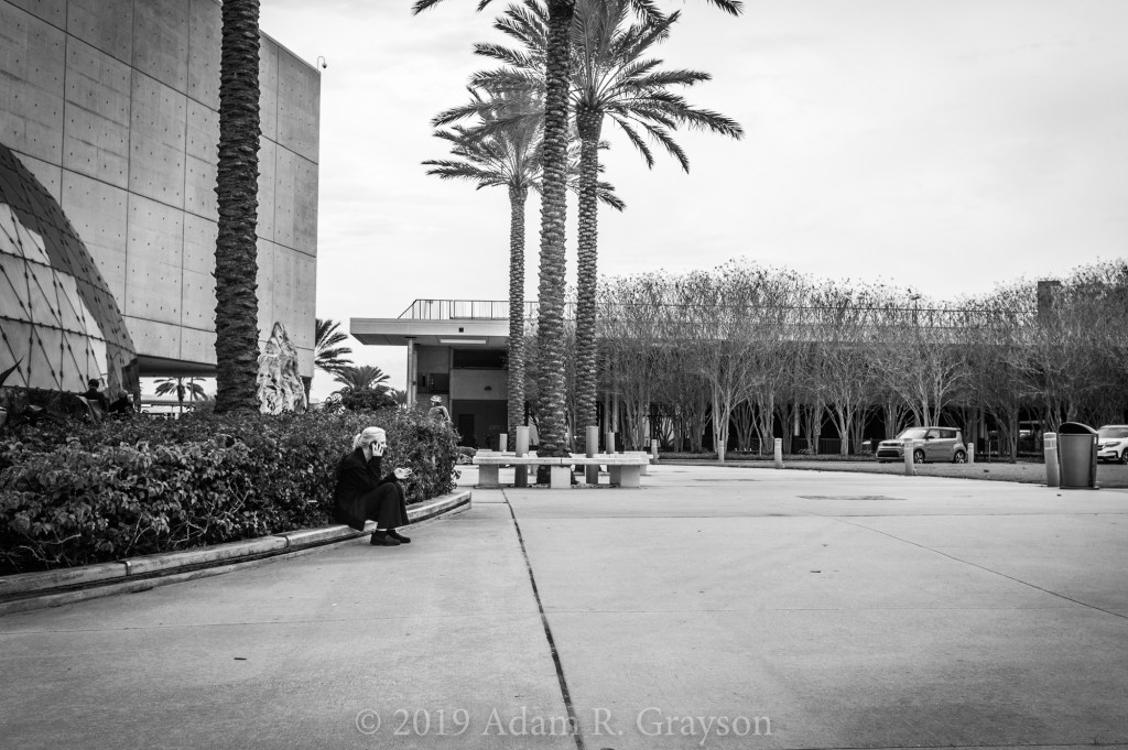 Not sure if this photo qualifies as street photography, but it is of a stranger and in black and white:) Hopefully the context is there, though.. This lady was taking a smoke break as my friend John and I entered the Dali museum, and was still there when we left. Same spot. Same pose. Same conversation? Maybe the bushes hide her from supervisors looking for missing employees, or maybe she just likes sitting there on the concrete curb angrily talking on the phone while chain-smoking. I guess the only way to find out is to go back and see if she is still there. John, you down for another visit?