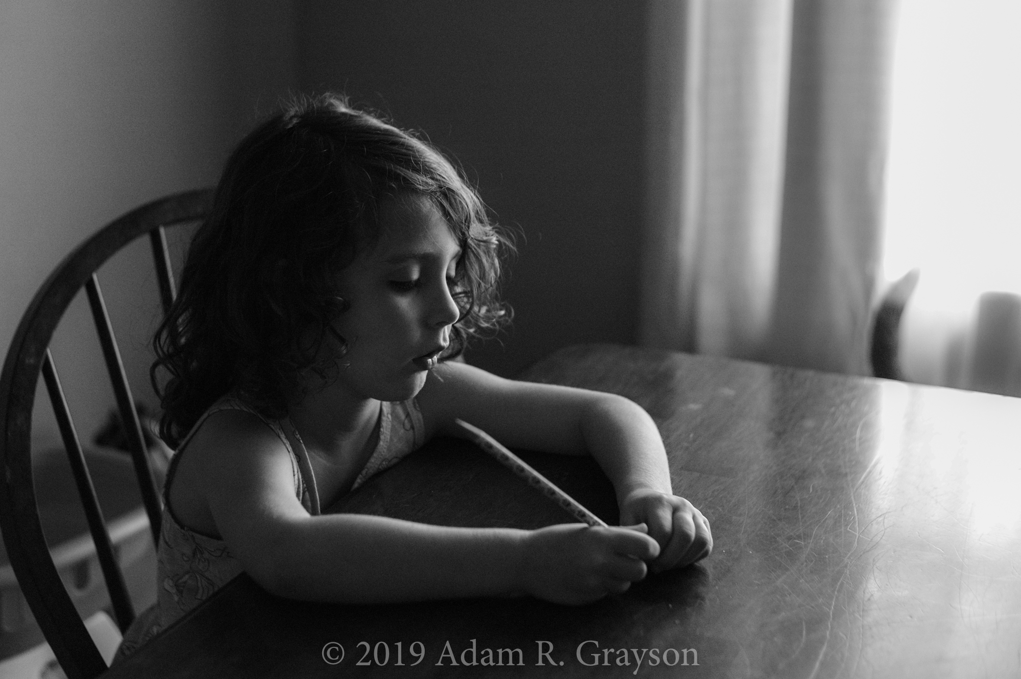 My youngest daughter was sitting at the dining room table doodling and stopped to take a mental break, or space out, as we all do from time to time. Thankfully the break lasted long enough for me to grab my camera and take a few photos before the spell broke and she got mad at me for taking her picture yet again..