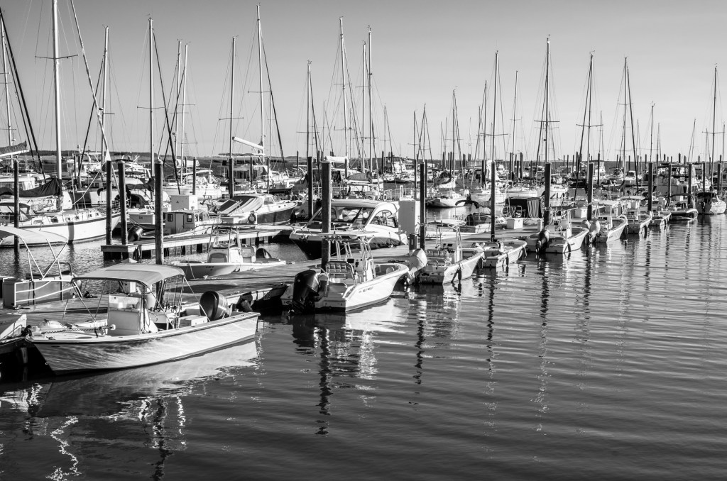 Guess I am on a monochrome kick these days.. Here is one from the harbor where the boat left from the No Dolphin Sunset Tour. Standing there, it looked like an army of party-goers awaiting orders. Orders to set sail at a moment’s notice to have a good time – rock on little boats, yachts, and pirate ships!